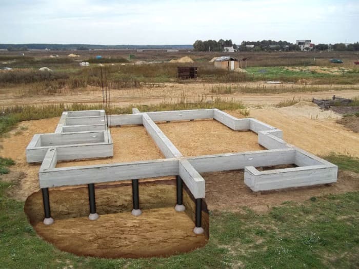 При строительстве свайно-ленточного фундамента, где лента выполнена в виде ростверка, «парящего» на сваях, снижается объем земляных работ. Это сокращает сроки строительства, снижает его стоимость. Такой тип фундаментов является оптимальным на неустойчивых грунтах: песчаном, глинистом и т.д. Удобен он и при холмистом характере местности, где за счет маневра длиной свай легко добиться горизонтальности основания, экономя на проведении сложной планировки земли тяжелой техникой. При индивидуальном строительстве можно вообще обойтись без применения тяжелой техники. Единственная область ее применения – транспортировка и укладка бетона при создании ростверка, если объем бетонных работ значителен.