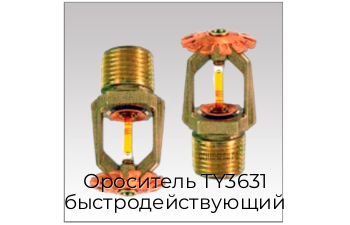 Универсальные спринклеры модели TY 3631 (старое название - модель А) представляют собой автоматические спринклеры колбового типа. Спринклеры могут устанавливаться как розеткой вниз, так и розеткой вверх. При любом типе установке они производят распыл сферической формы - примерно 50% потока воды отражается вверх от розетки, остальная часть потока распыляется вниз.