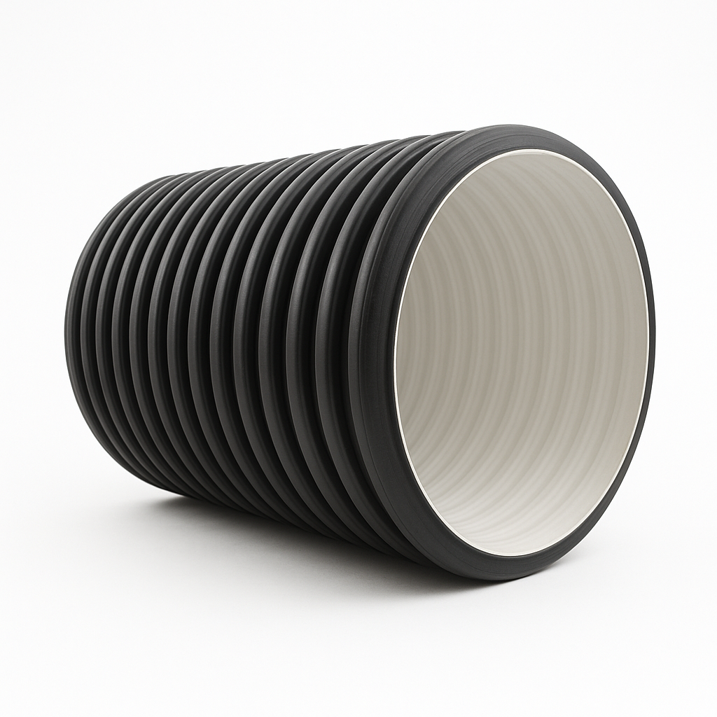 Конструкция: Двухслойные гофрированные раструбные трубы черного цвета внешне, а также черного цвета изнутри. По структуре трубы устойчивы к УФ-излучению.