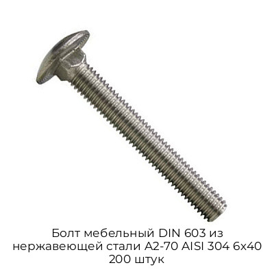 Купить Болт мебельный DIN 603 из нержавеющей стали A2-70 AISI 304 6х40 200 штук в Москве с быстрой отгрузкой и доставкой по выгодной цене вы можете в компании Черметком. Мы поставляем металлопрокат оптом и в розницу, работаем как с организациями, так и с частными клиентами.